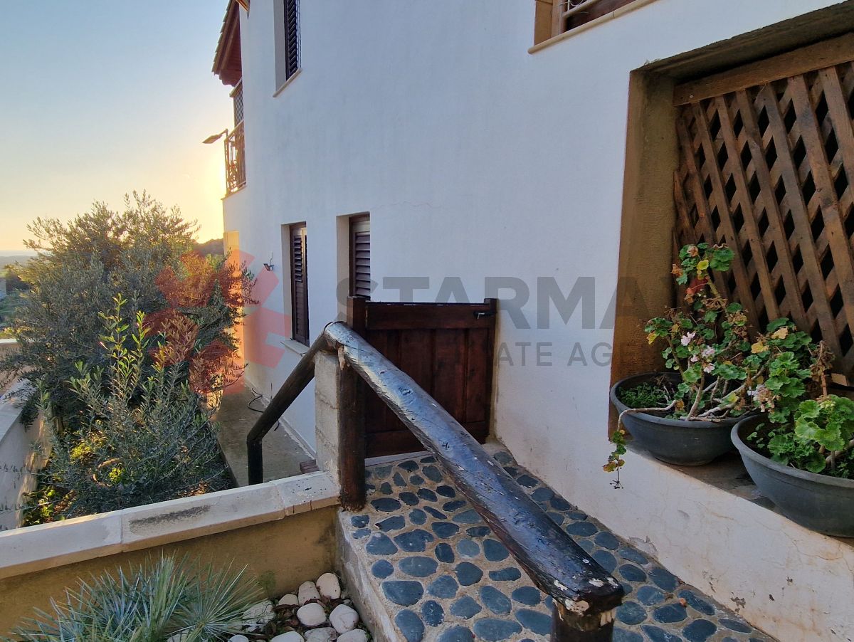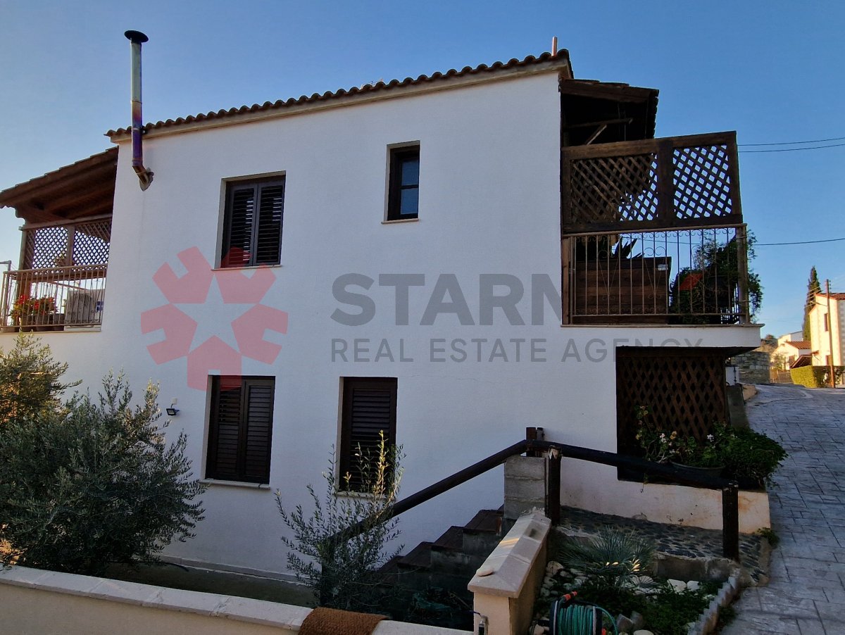 Designed to maximize light, space, and views, the upper level features a bright open-plan kitchen, living, and dining area, centered around a welcoming fireplace, creating a warm and inviting atmosphere. From this level, the home opens onto a covered balcony, ideal for outdoor dining and relaxation while enjoying panoramic sea and mountain views. A guest WC completes the upper floor.