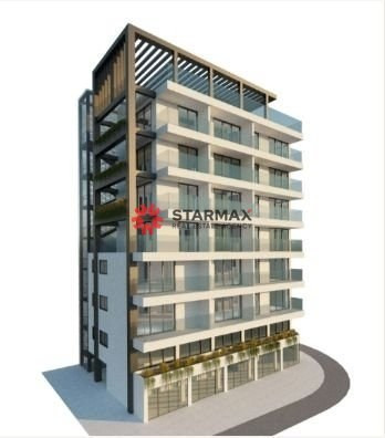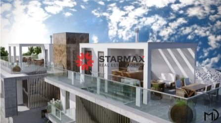 Open plan kitchen with living areas, 135m² internal area, with front balcony and a roof garden stretching to 100m2 for great views and distant sea view.