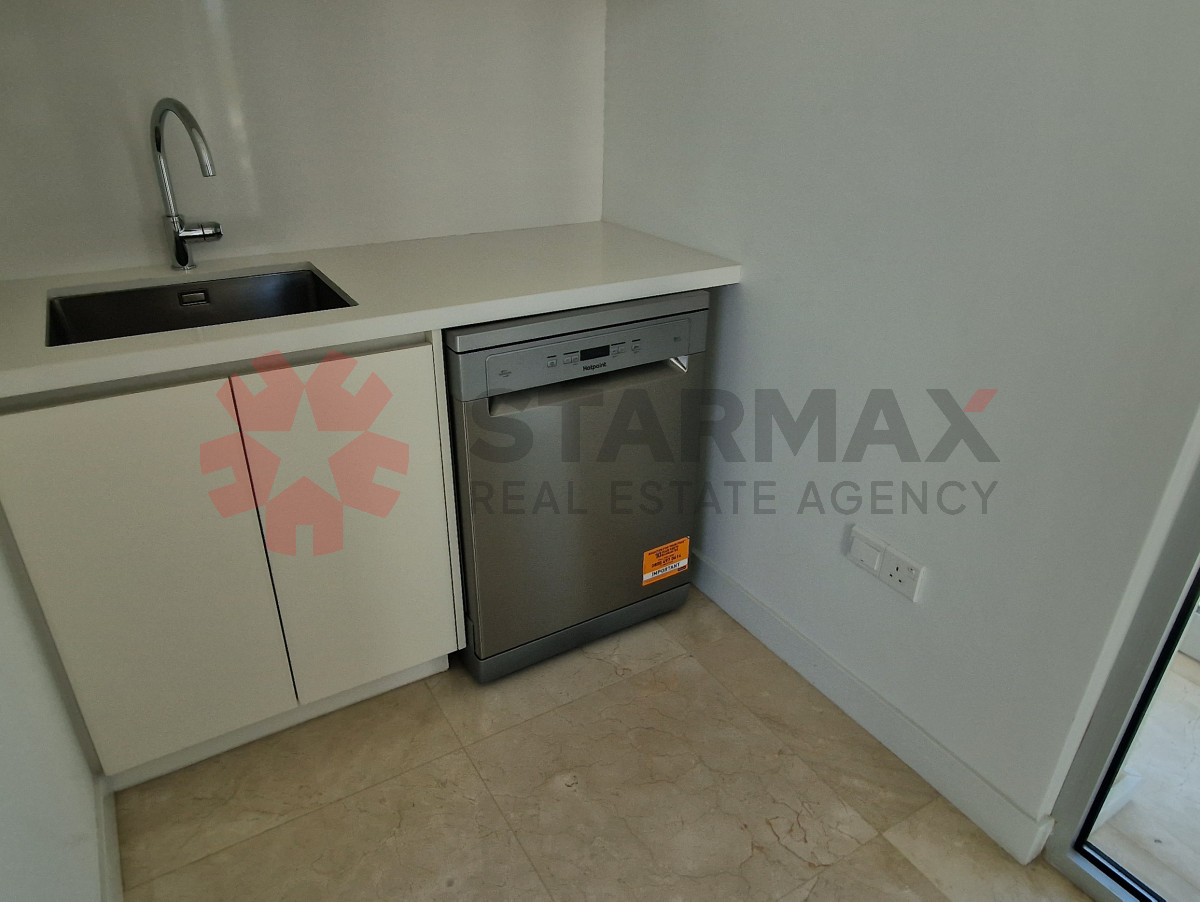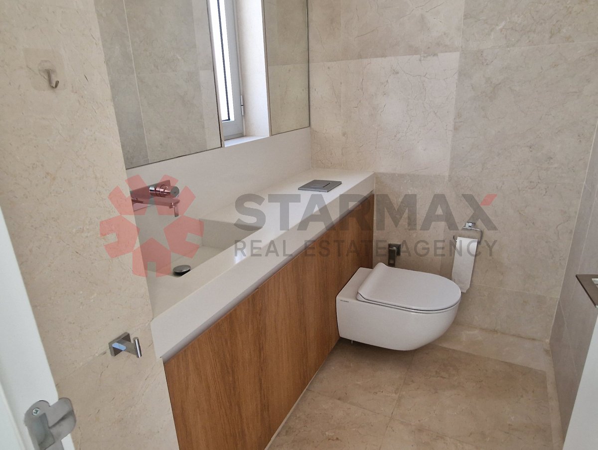 The first floor features an impressive open-plan living and dining area with a contemporary designer kitchen, a guest WC, and large patio doors that open onto a spacious balcony overlooking the Mediterranean, creating the perfect space for entertaining and relaxing.