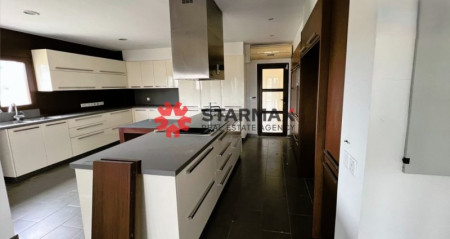 It has a total area of 430sqm. The ground floor of 210sqm consists of an open plan living/dining room, a kitchen with a sitting/dining area, a guest toilet and two covered parking areas. The first floor of 220sqm consists of four en-suite bedrooms. There is also a basement of c. 200sqm comprising of storage areas, a wine cellar and a laundry.