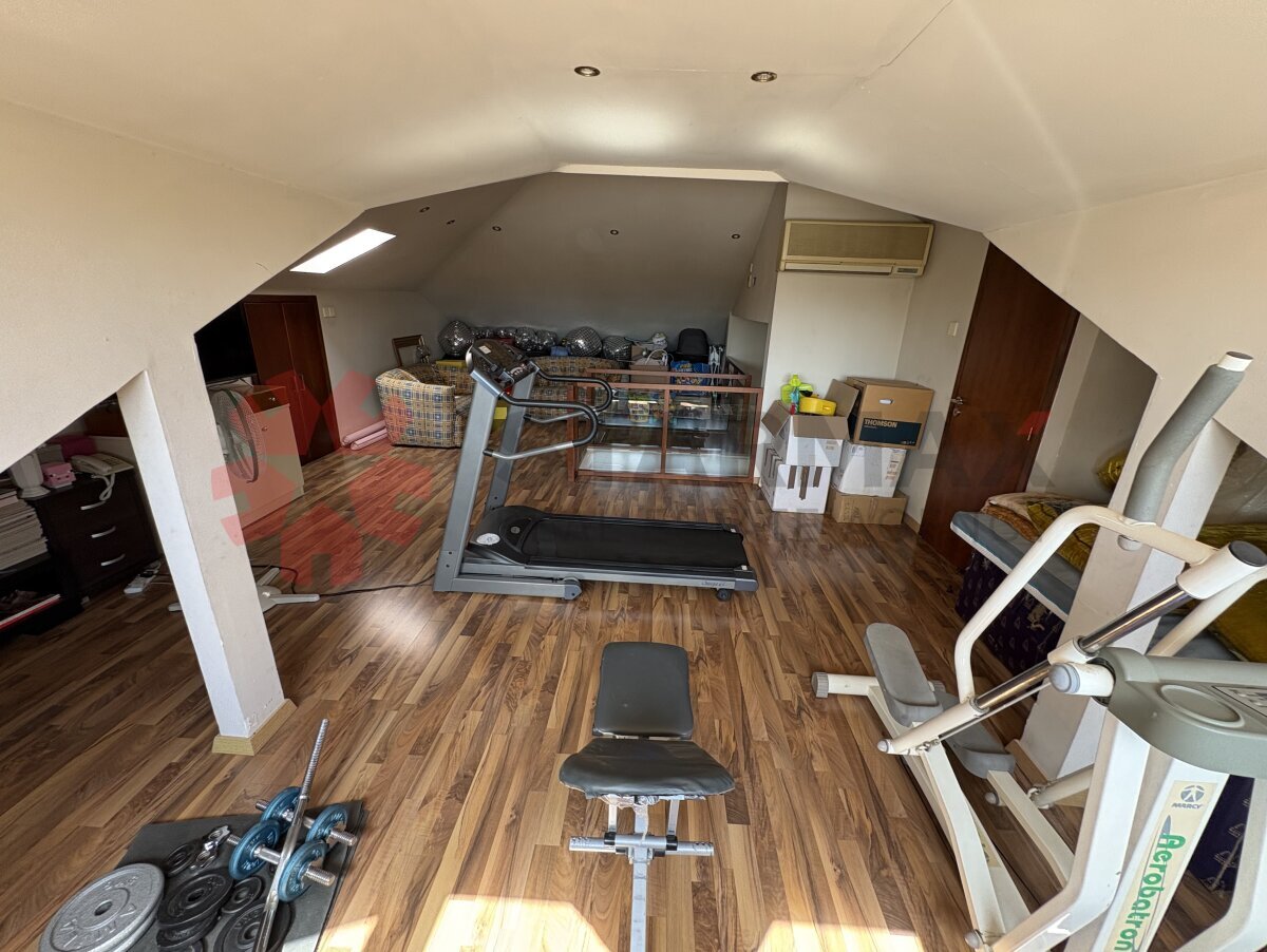 Upstairs, there are four well-proportioned bedrooms, including a master suite with a walk-in wardrobe and private ensuite bathroom. A large stylish landing area connects the bedrooms and leads to a family bathroom. The converted attic serves as a versatile recreational space, currently used as a home gym.