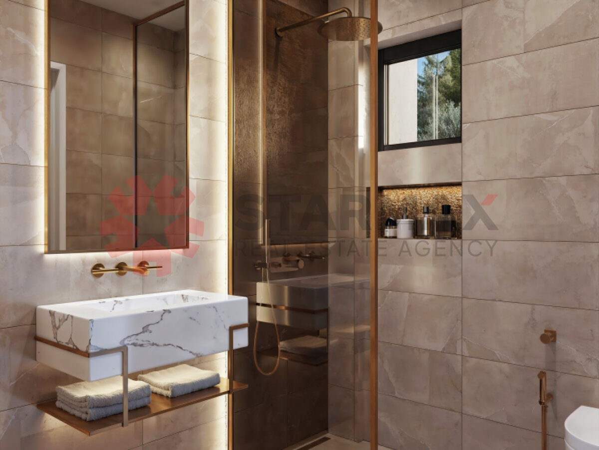 The 142 m² villa features two bedrooms, four bathrooms, and a separate 1 bedroom guest room, an open-plan modern kitchen, floor-to-ceiling glass doors, air conditioning, smart home compatibility, and a solar-powered water heating system.