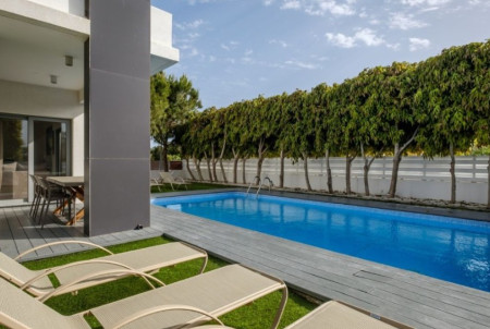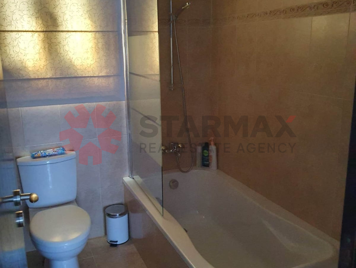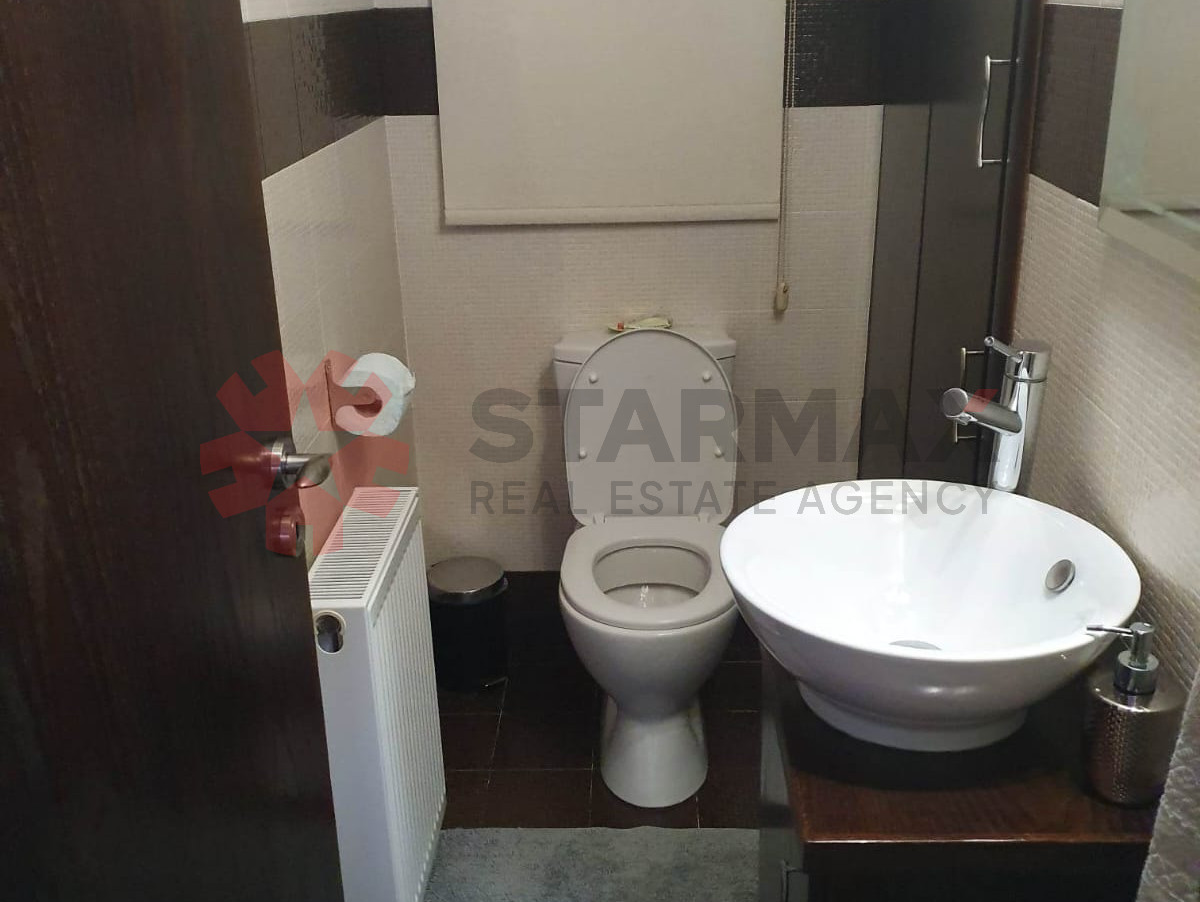 On the ground floor, you will find a large separate kitchen fully equipped with electrical appliances and small appliances, a comfortable living area with a fireplace, a laundry room, guest toilet with washbasin, and storage room. The house offers central heating throughout all areas, including bathrooms, as well as full air-conditioning.